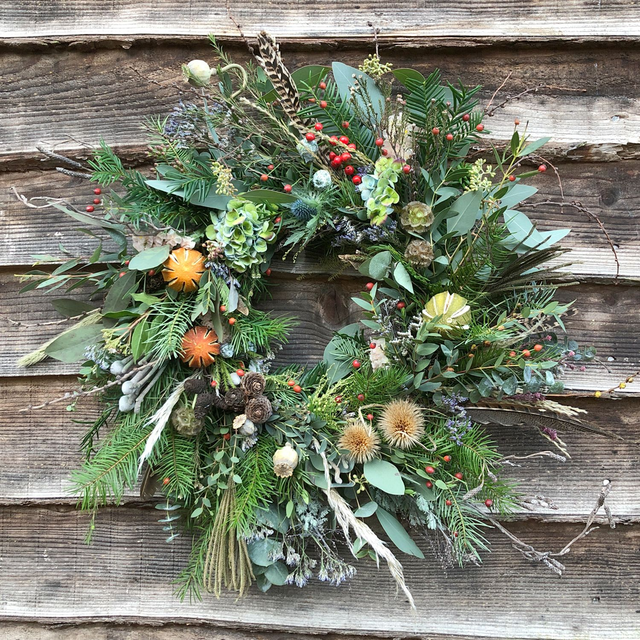A natural wreath with a moss and fir base. We need a week to prepare and post your wreath. If you have a preferred delivery date please enter it in the 'Message to Merchant' section when you pay. If you would like a velvet ribbon added to your wreath, please let us know your colour preference in the 'Message to Merchant' section.